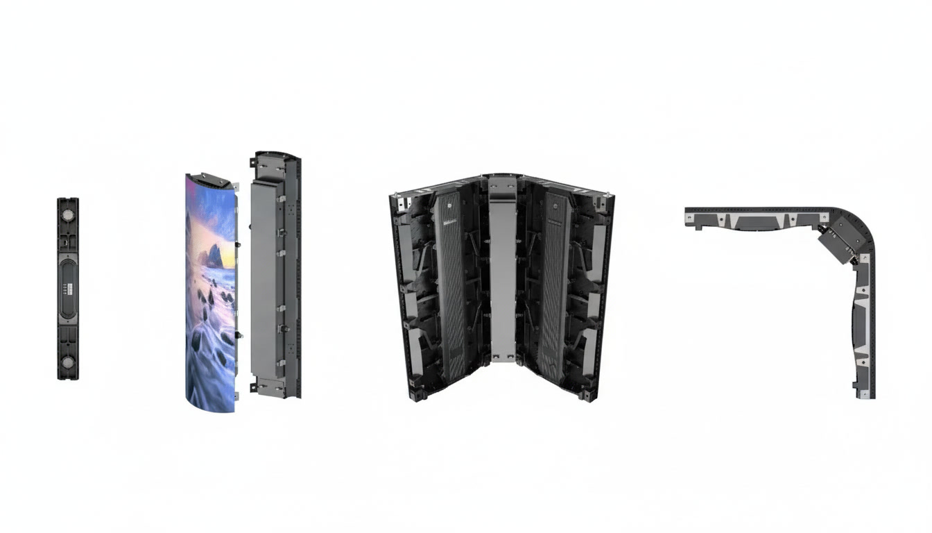 - تصميم مائل (45°): تسمح خزائن الشاشة بتصميم زوايا منحنية أو قائمة بسهولة لتناسب مختلف الواجهات المعمارية.